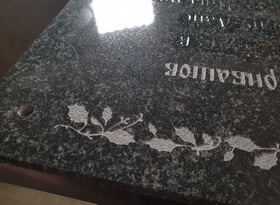 Далее снова повторяется процедура зачистки, на фотографии ниже показан конечный результат – готовая табличка, на которой нет ни следа лишнего. Каждая буковка аккуратно обработана и зачищена, на полированной поверхности гранита нет ни царапинки.