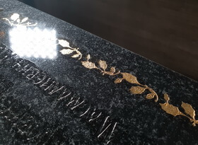 Саму гравировку мы выполнили при помощи пескоструйного аппарата и сразу же принялись за покрытие текста сусальным золотом. Начали с орнамента, так как работать с элементами декора проще, чем с печатным текстом.
